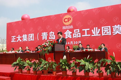 奠基仪式由正大集团资深总裁李瑞寒先生主持。仪式第一项由正大集团资深副董事长于建平先生介绍项目情况,他说:“正大集团(青岛)食品工业园项目,计划总投资12亿元人民币,规划新建3个食品加工厂,扩建1个加工厂及相应配套的生产、生活设施,总建筑面积2.2万平方米,生产油炸、香肠、面食、米饭等新产品。2013年建成后,可形成各类新产品年产能4.3万吨、年销售收入30亿元人民币。正大集团(青岛)食品工业园的兴建,将是在这片神奇的土地上,崛起的一座更适应生产、生活的现代化的新食品工业园区,一个可持续发展的、新的经济增长点。”仪式第二项由即墨市郑德雁市长致辞。仪式第三项由青岛市、即墨市、正大集团的各位领导为正大集团(青岛)食品工业园挥锹奠基。