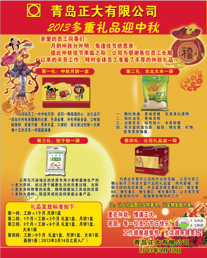 月到仲秋分外明,每逢佳节倍思亲。值此仲秋佳节来临之际,公司为感谢各位员工长期以来以厂为家、兢兢业业的辛勤劳作,特为员工们准备了丰厚的仲秋礼品:中秋月饼一盒;公司礼品盒一箱;东北大米一袋;饺子粉一袋。