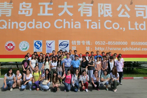 师生们首先参观了厂区外围,大家对青岛正大优美的园区环境赞不绝口,并不时合影留念;在郭春莲厂长的推荐下,品管部梁明经理担任车间讲解,由于人员众多,不便现场进入,师生门仅在参观走廊隔窗观察,大家通过提问表现出对生动的工作现场的极大兴致。