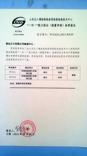 青岛正大检测中心于2015年5月参加了有山东出入境检验检疫局检验检疫技术中心组织的食品中“单核细胞增生李斯特氏菌”“一对一”能力验证(测量审核),整个过程科学公正、准确有效,并且完全符合CNAS(中国合格评定委员会)的规定。通过此次能力验证充分说明了检测中心科学严谨的检验流程,严把食品安全品质关,为广大消费者提供安全、健康的食品而不懈努力。